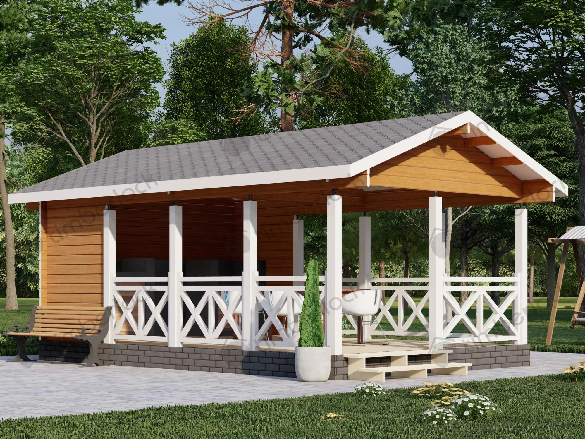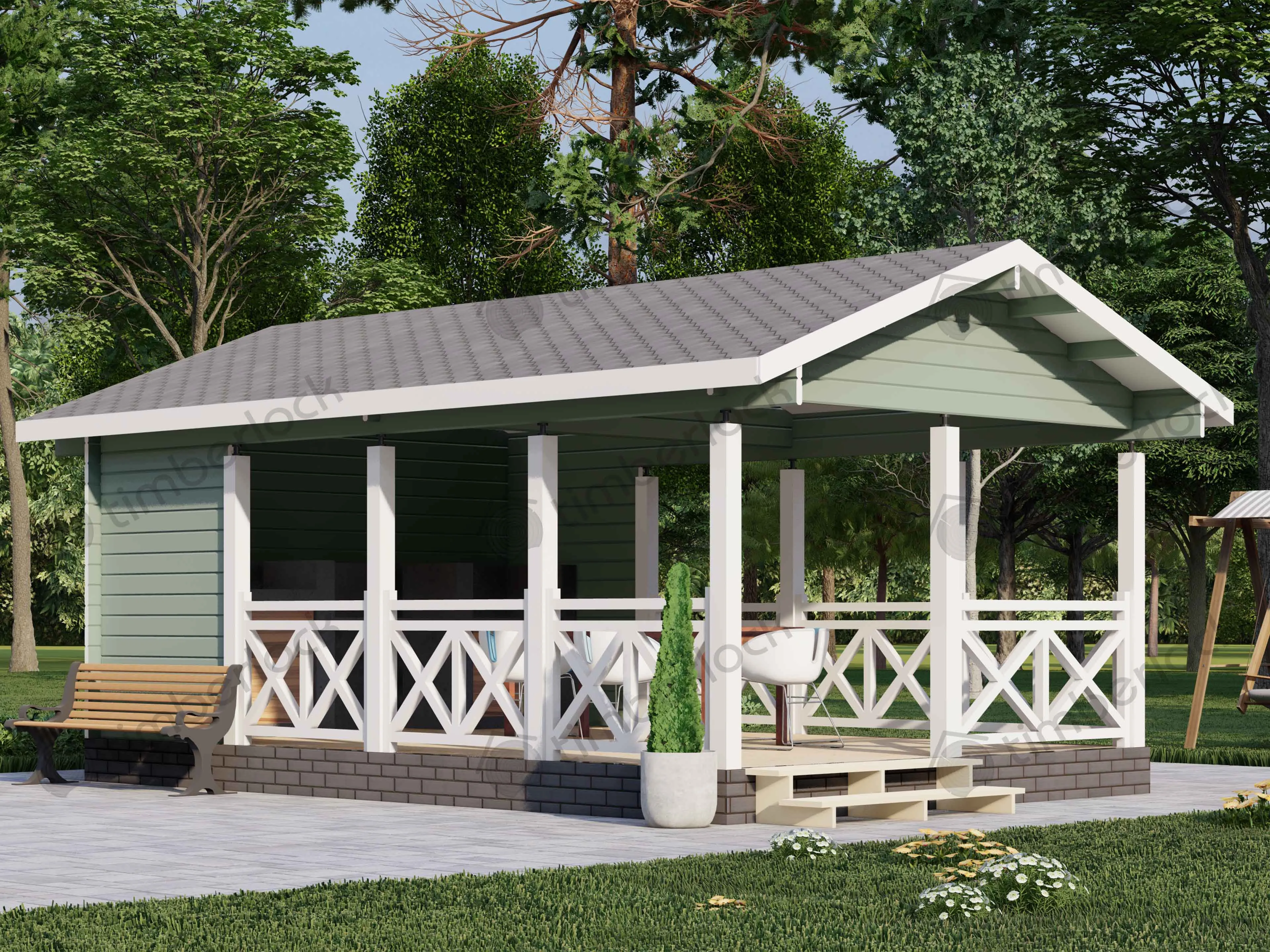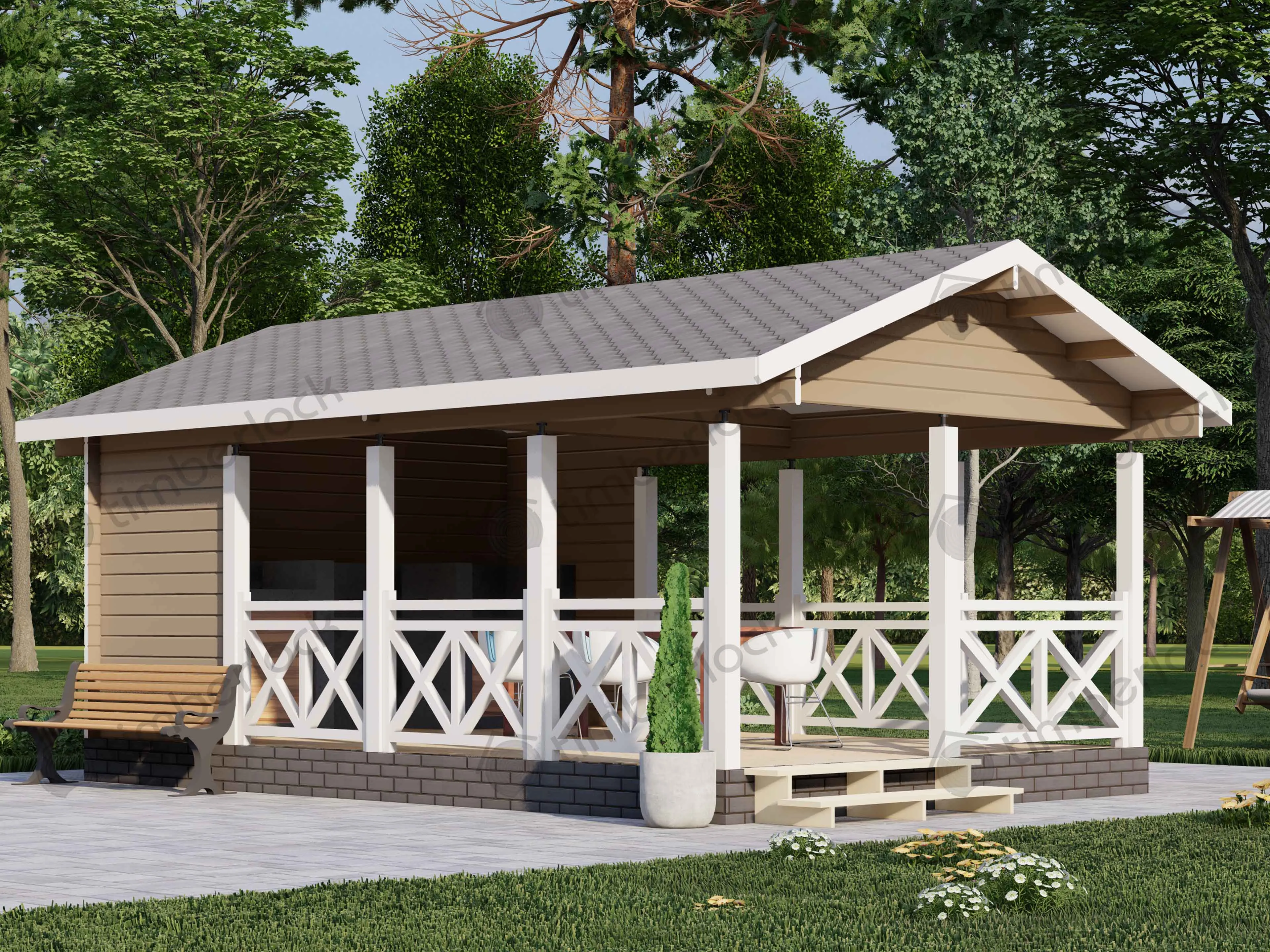 Просторная открытая беседка является отличным местом для отдыха большой дружной компании. Площадь беседки позволяет зонировать на полноценную зону барбекю и просторную и удобную столовую на свежем воздухе.