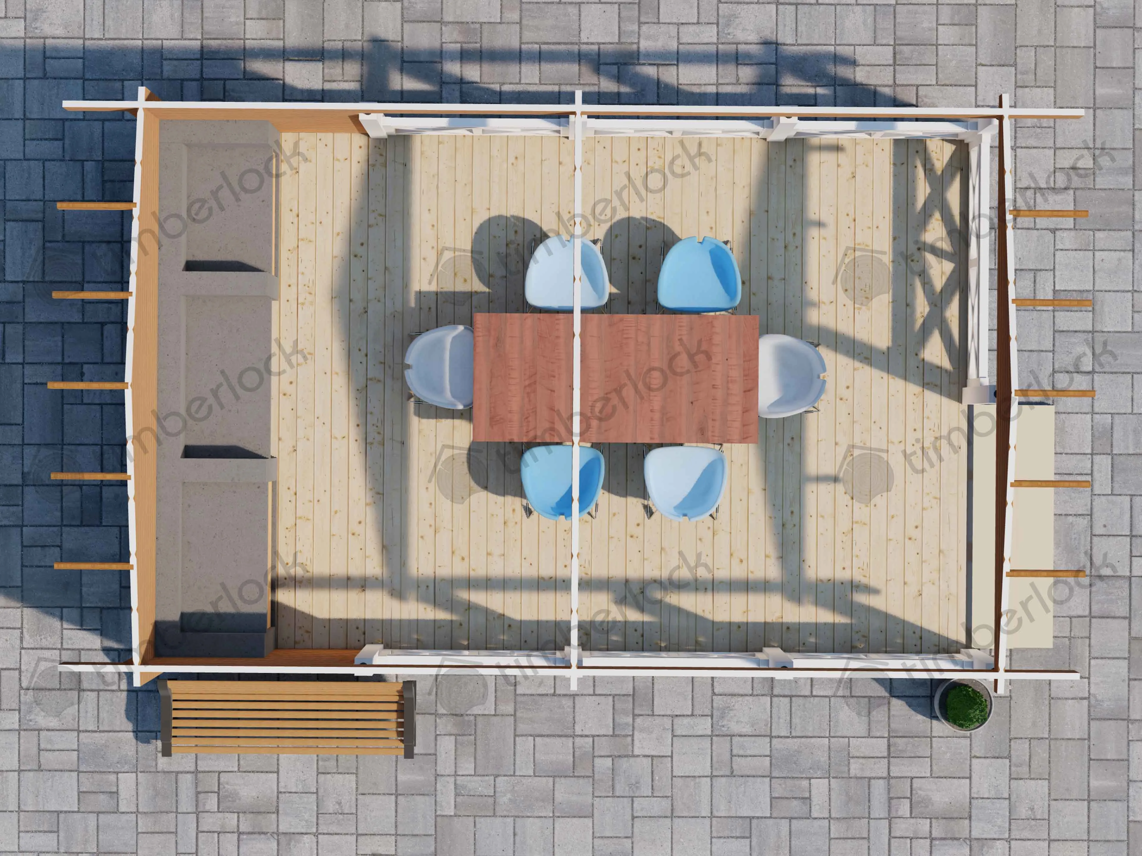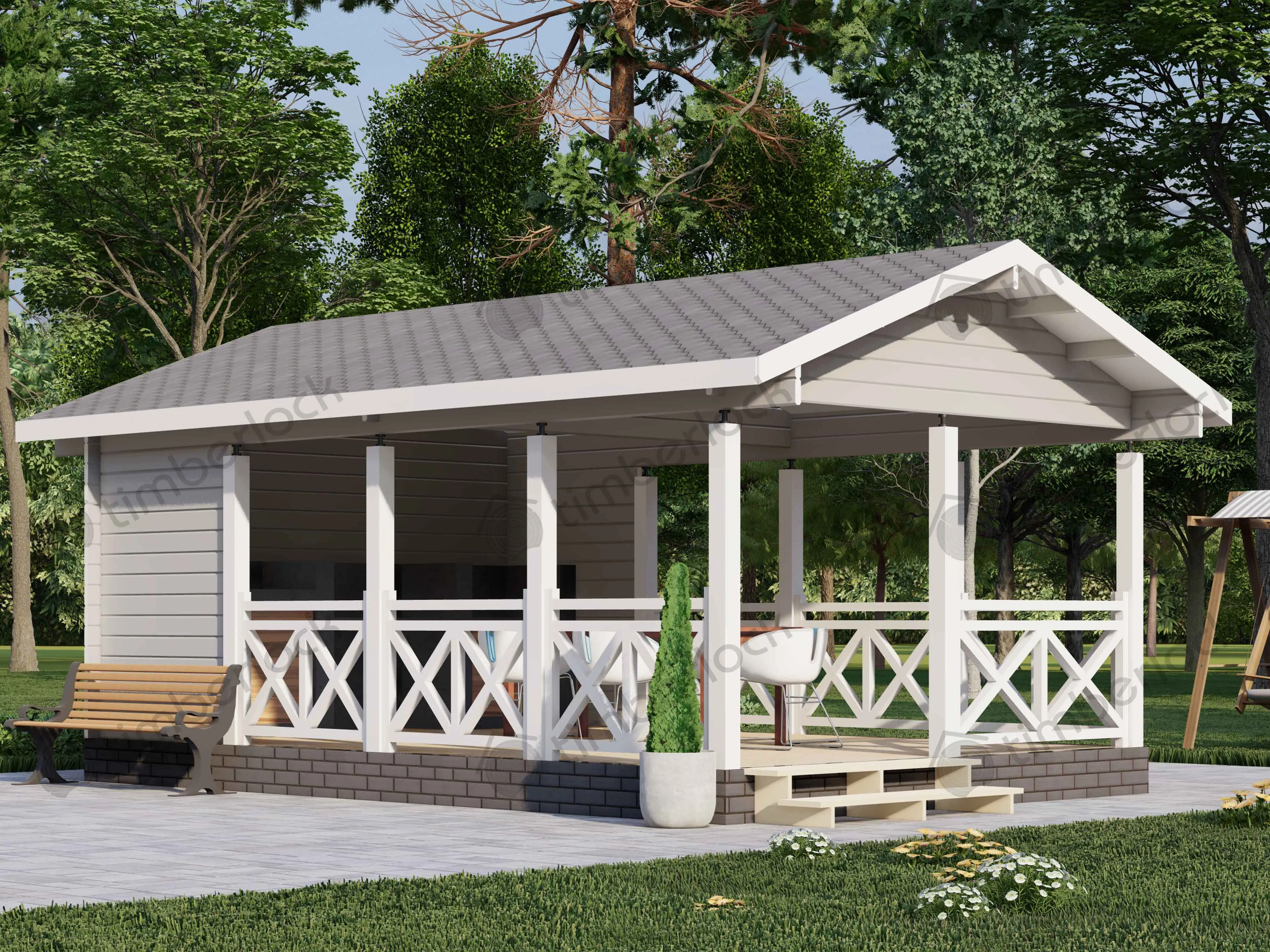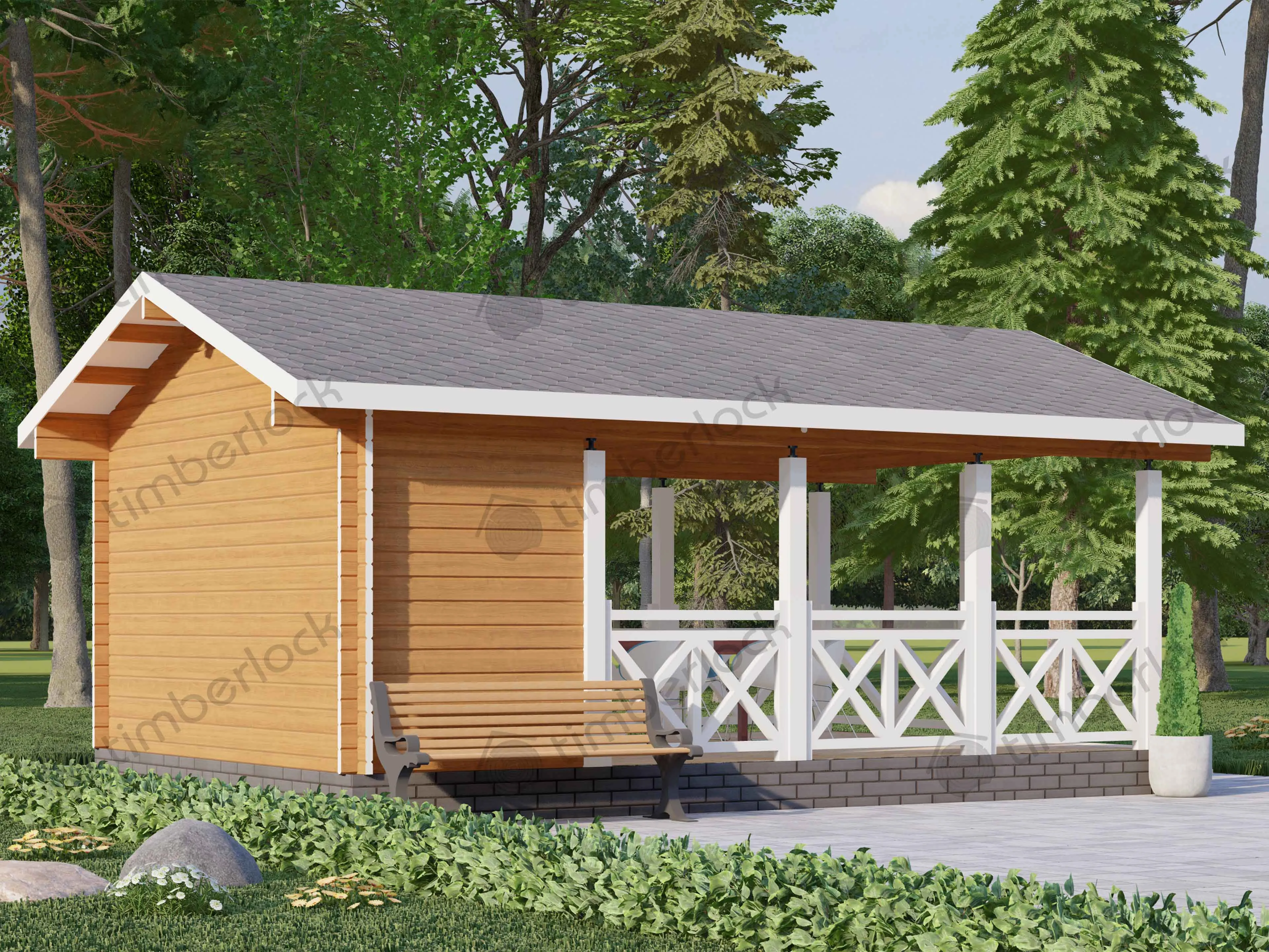 Просторная открытая беседка является отличным местом для отдыха большой дружной компании. Площадь беседки позволяет зонировать на полноценную зону барбекю и просторную и удобную столовую на свежем воздухе.