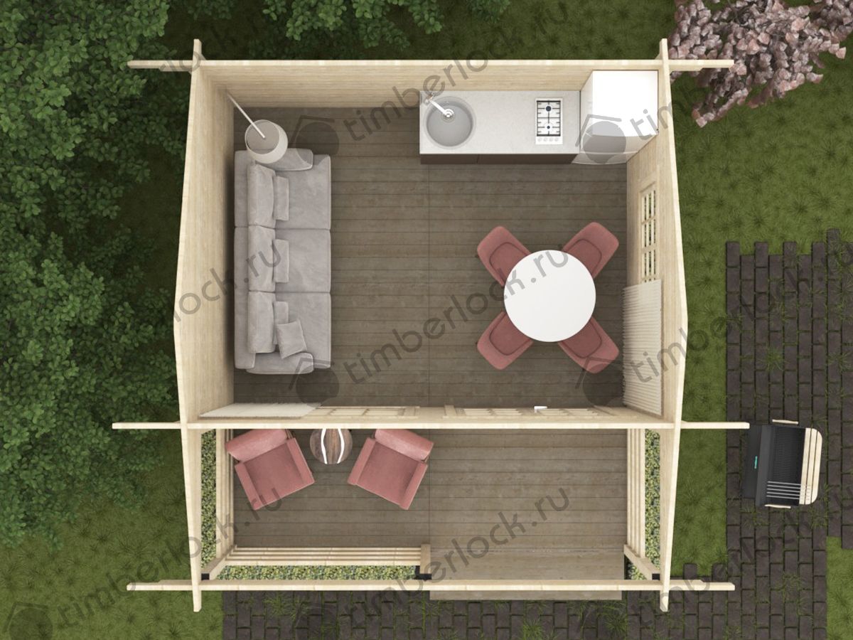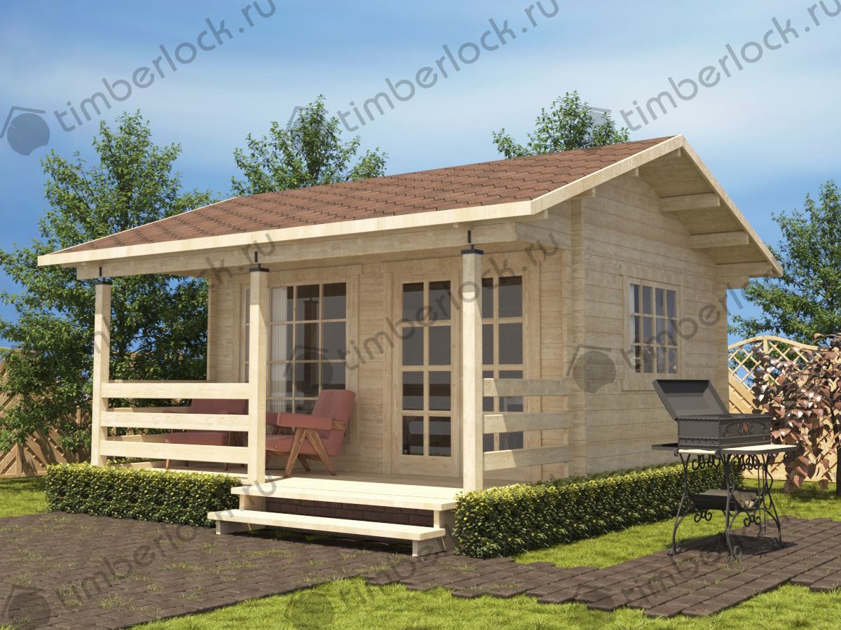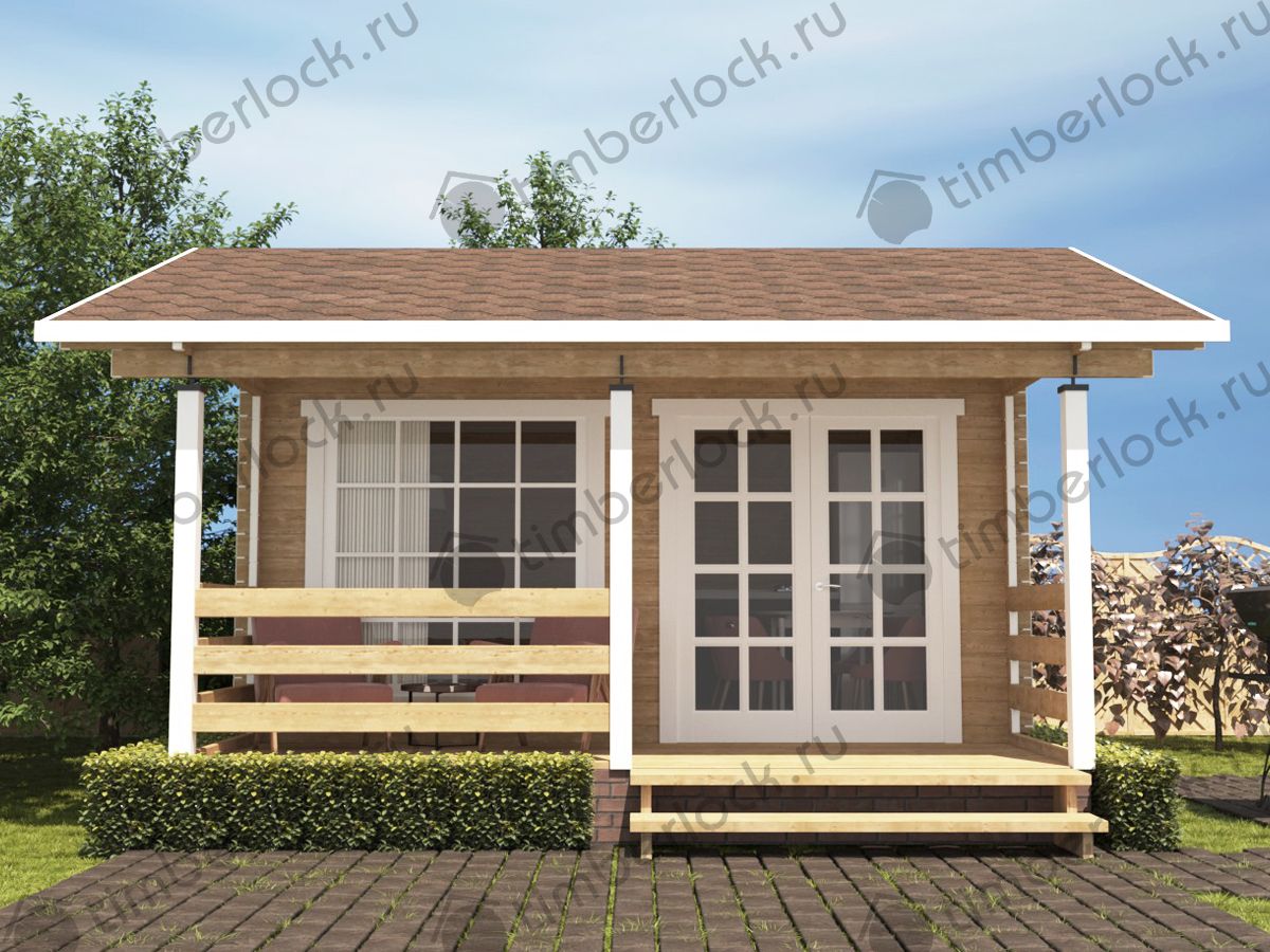 Минималистичный садовый домик небольших размеров с верандой подойдёт для небольшого участка. Может использоваться в качестве летней кухни.