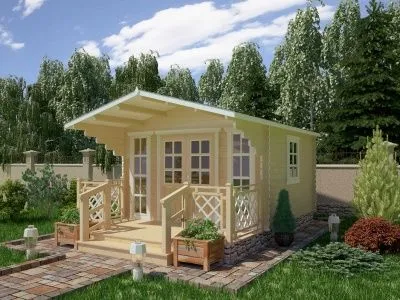 Лаконичный садовый домик с витражными окнами и пристяжной верандой.